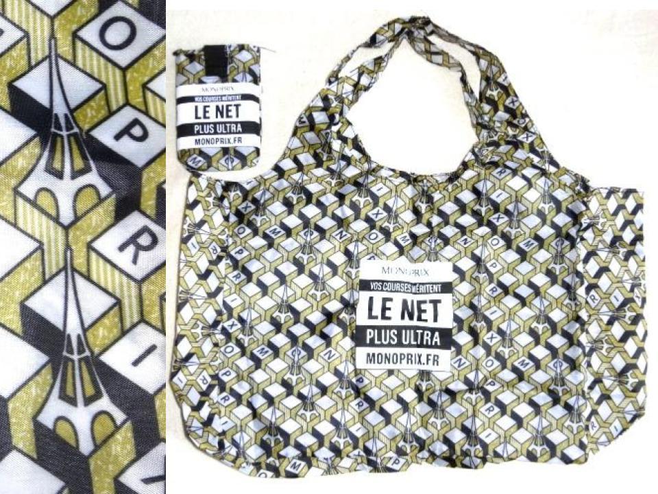 > 日本未販売 フランス パリ MONOPRIX モノプリ エコバッグ エッフェル塔 幾何学模様 新品 折り畳 携帯収納 軽量 新品 カーキ ブラック ロゴ