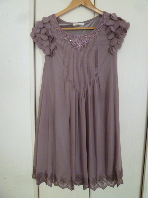 - axes femme/アクシーズファム○くすんだパープル系肩フリルシフォンワンピースM/レースお花モチーフ裾スカラップ結婚式フォーマル○OP1119