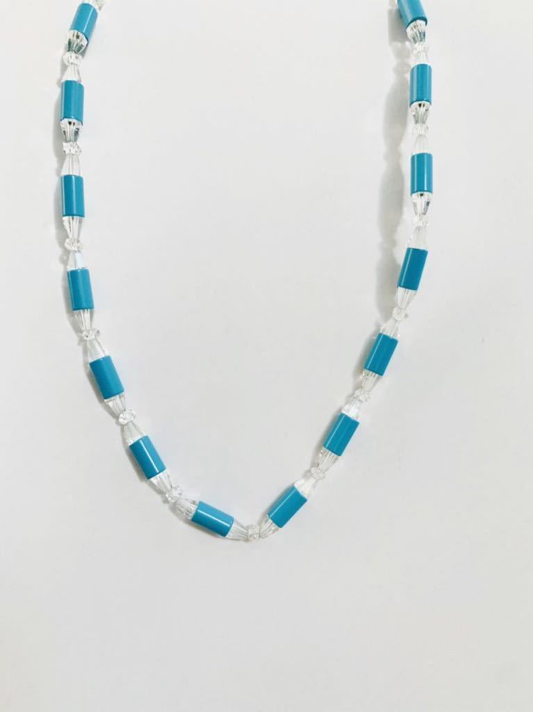 > 【美品】ヴィンテージ? ターコイズビーズ 水晶silver刻印有 ネックレス ブルー×クリア ストライプ しましま 銀製 お花クラスプ