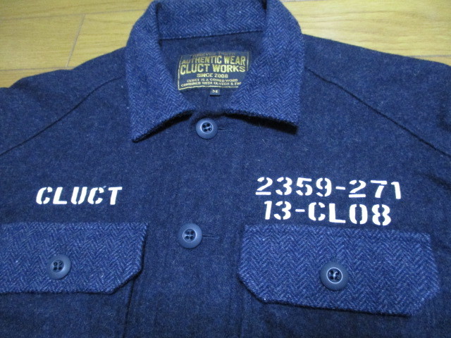 > 日本製 CLUCT ステンシル ウールシャツ Mサイズ 長袖 切り返し 切替 WOOL 青系 ARMY ミリタリーテイスト