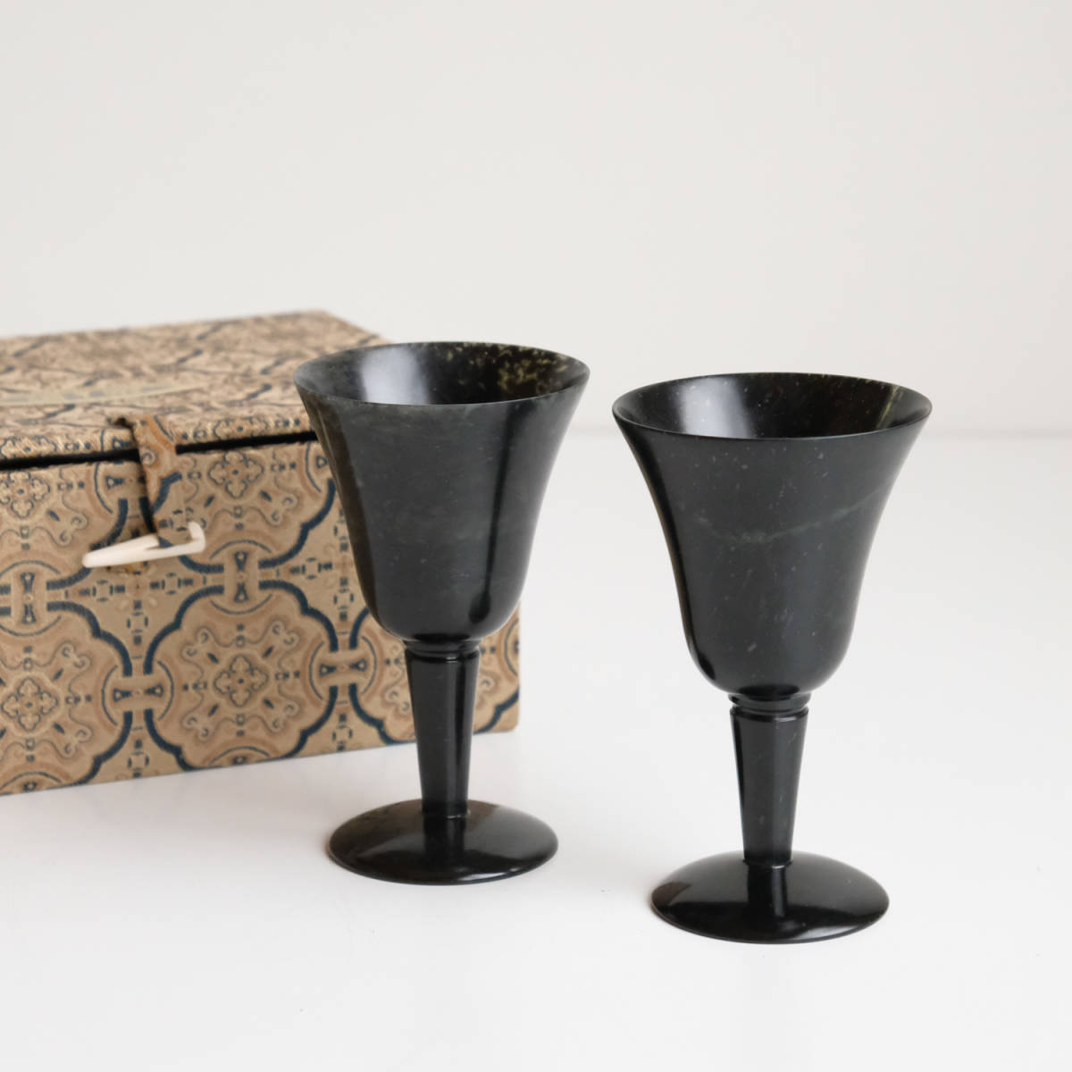 - 中国 酒泉 石杯 盃 グラス 石細工 高脚杯 酒器 2客セット
