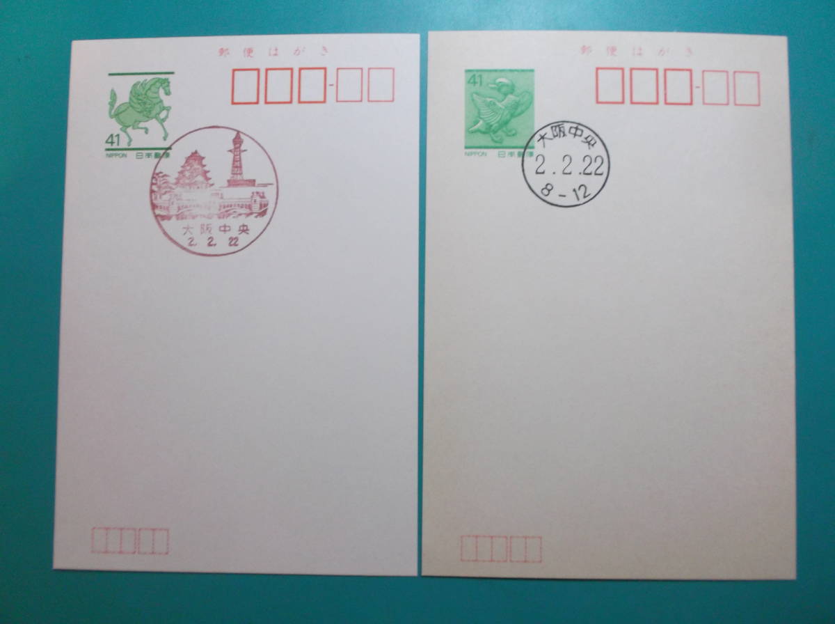 - お選び下さい(①組~⑨組の内)H2.2.22 記念日消印葉書①大阪中央②大阪中央B③大阪中央貝④大阪中央茨木⑤切手9枚⑥メーター⑦同B⑧⑨