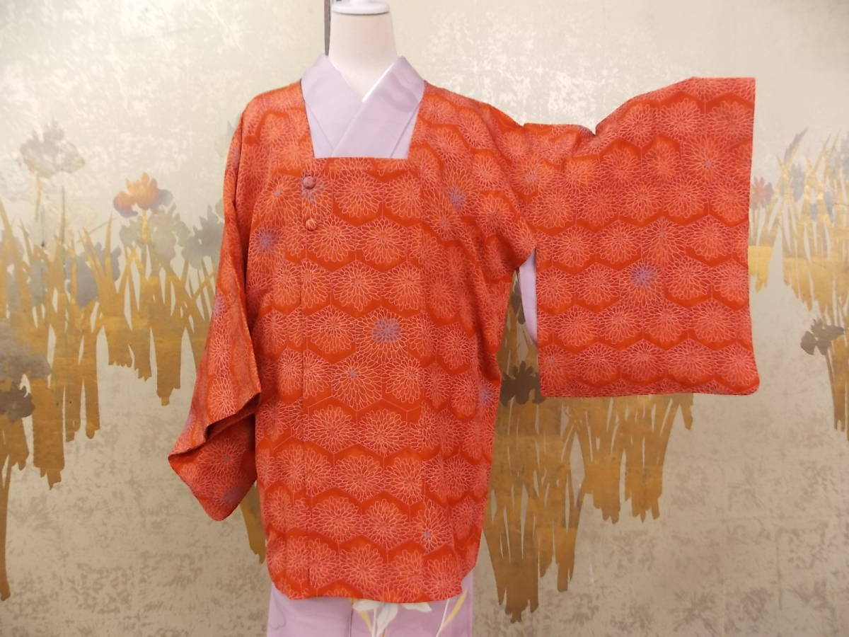 - きもの今昔2504 道行コートコレクション 正絹ちりめん小紋柄 レンガ色地線描き亀甲中に菊の花 国産絹の光沢弾力