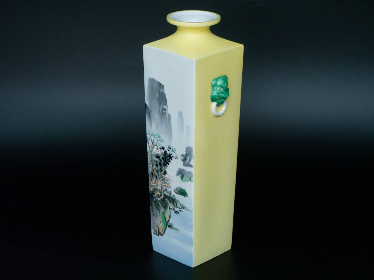 > 【値下げ交渉有り】アンティーク オールド ノリタケ 鹿印 昭和初期 1940~1952 ハンドペイント 黄地山水画 四方 獅子耳付 花入 花瓶 木箱付