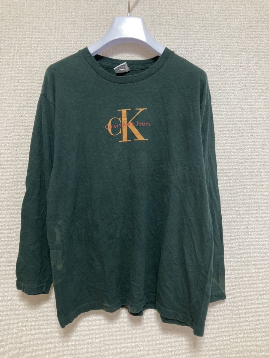 > 90's ヴィンテージ USA製 CK Calvin Klein Jeans カルバン・クライン長袖Tシャツ ロングTシャツ Logo Tee 緑 M /ダメージ USA古着 90年代