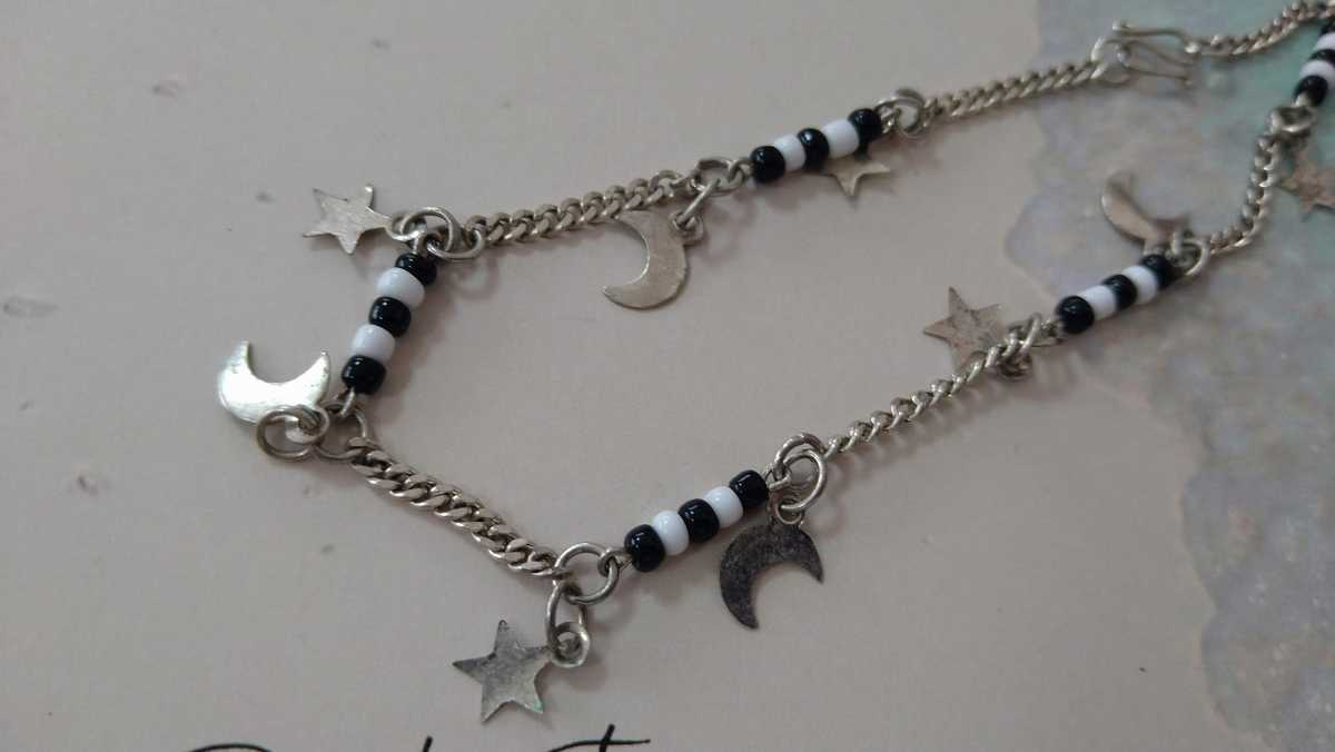 - □訳あり□シルバーカラー×黒×白□ムーン&スターモチーフ・ビーズブレスレット□