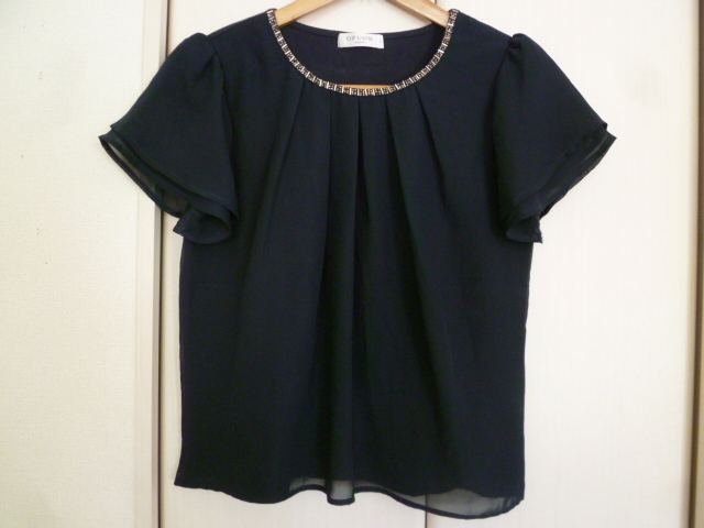 > OFUON/オフオン△紺前身シフォン異素材ビーズ付き2段フリル袖カットソー38/ネイビーイトキン半袖トップス△BO61