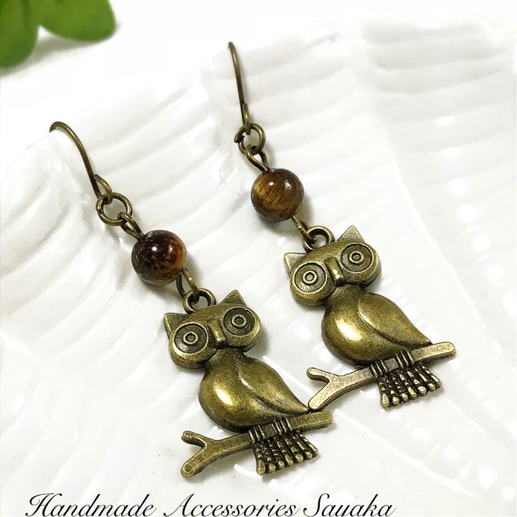- 新品即決◆ハンドメイド ピアス 天然石 タイガーアイ フクロウ ふくろう 鳥 手作り アクセサリー 金古美