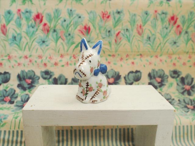 - レトロビンテージ雑貨 陶器・花柄パッチワーク風の小さなテリアのソルト入れ?☆キッチンテーブルミニチュア飾り