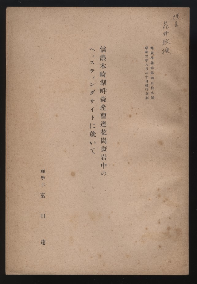 - 信濃木崎湖畔森産曹達花崗斑岩中のヘィスティングサイトに就いて 富田達 昭和3年 検:長野県 岩石 鉱物 地質 黒雲母