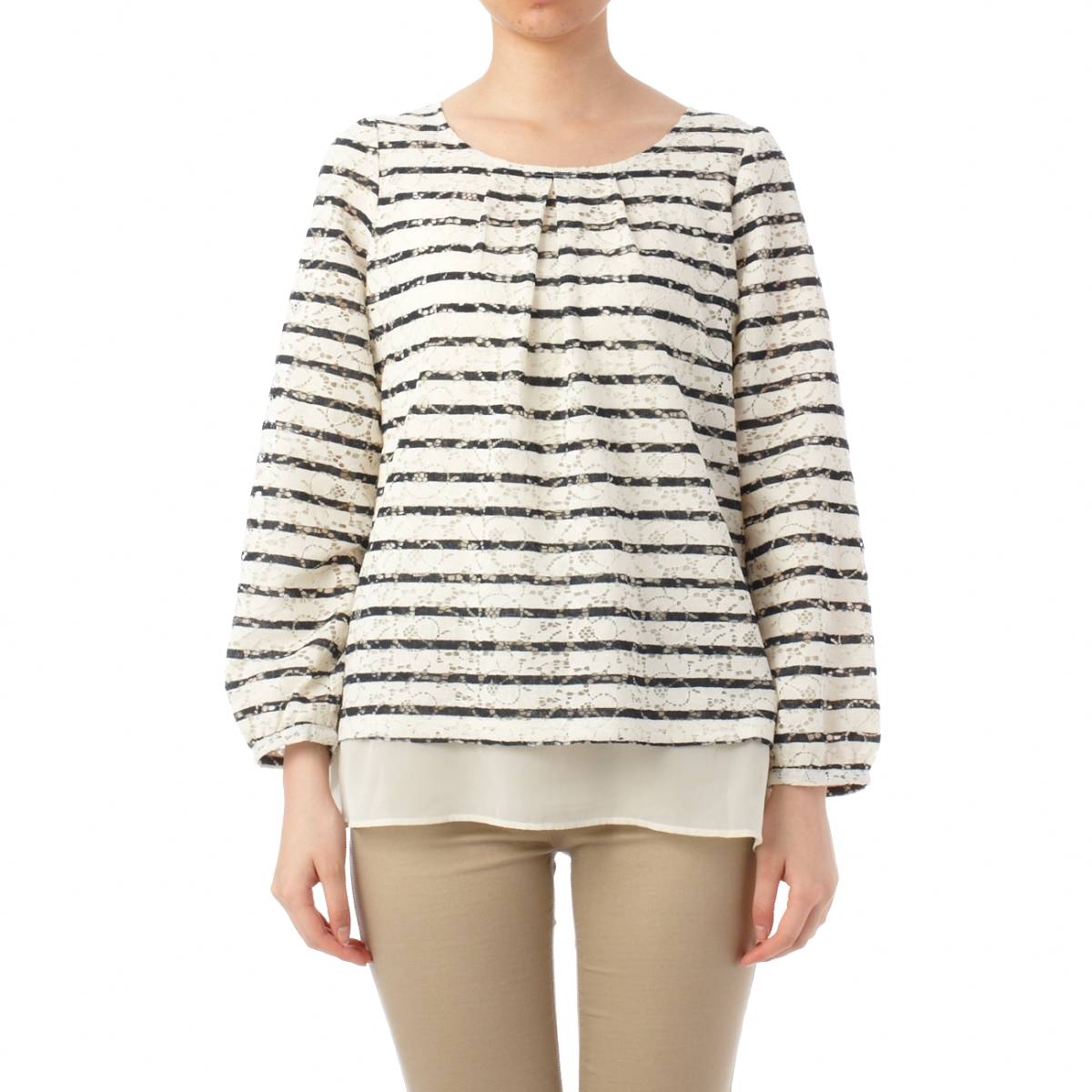 - grove*グローヴ*ワールド*カットソー*シャーリングストライプ*透け感*レース*上品ふんわり*美品*Sサイズ