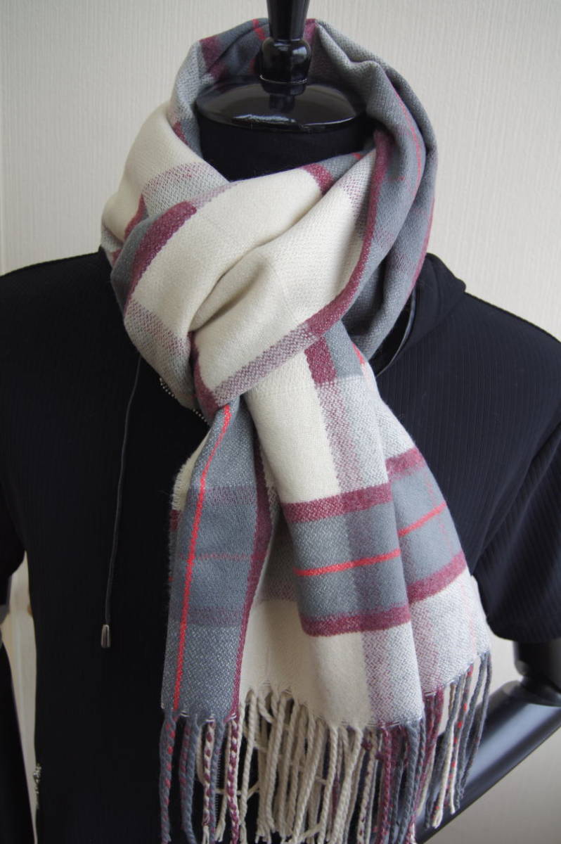 - カシミア100%英国”ストール”新作Blok-check/白グレー〇*:..azu00men