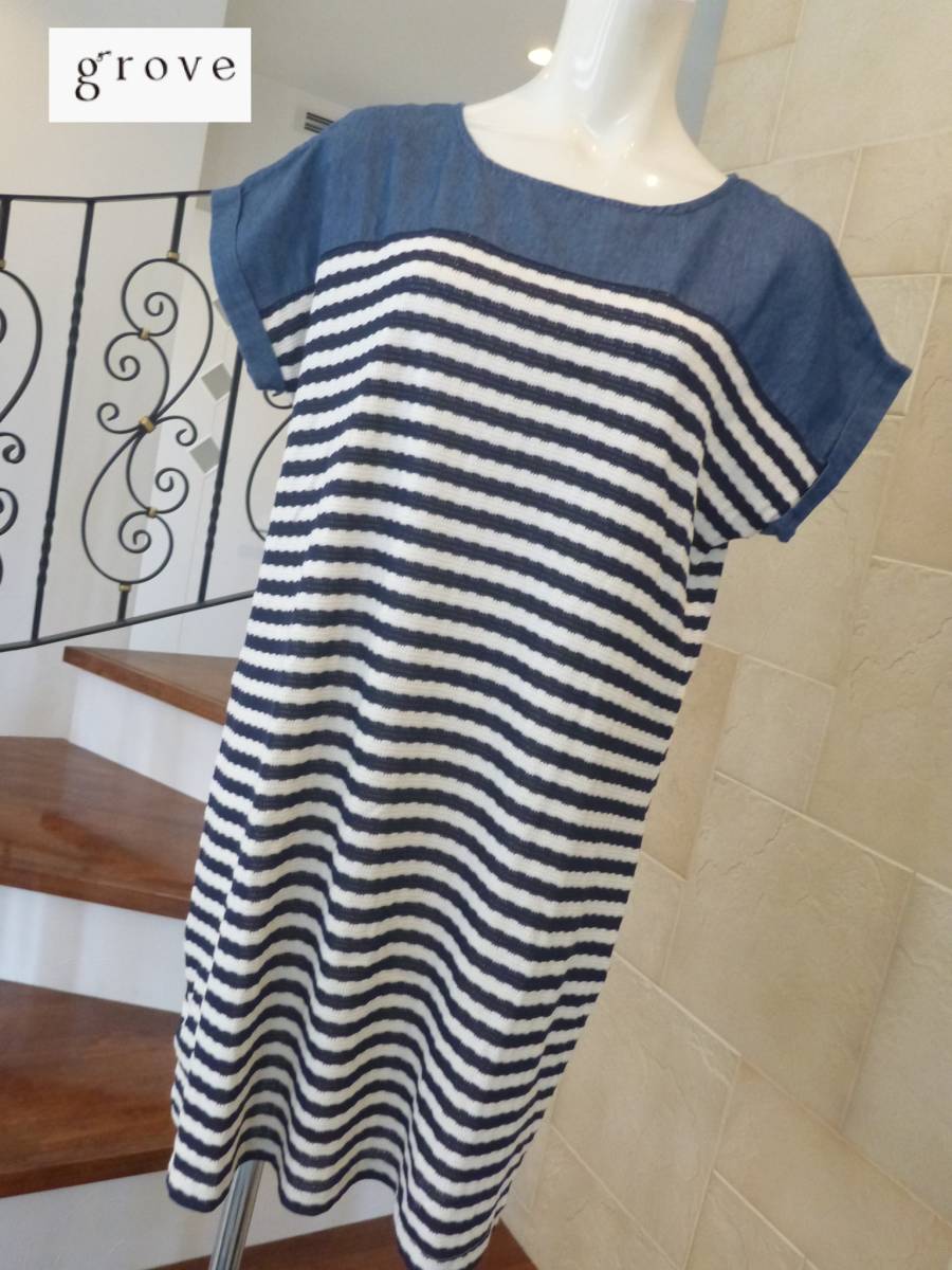 - 美品 grove グローブ ★紺 白 ドルマン 半袖 ワンピース L