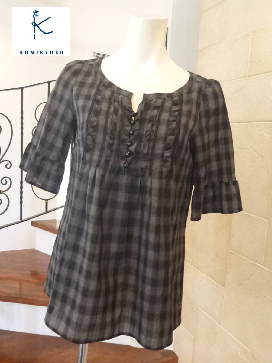 - 1.6万 組曲 KUMIKYOKU クミキョク ★日本製 黒×グレー チェック柄 半袖 ブラウス 2 M相当