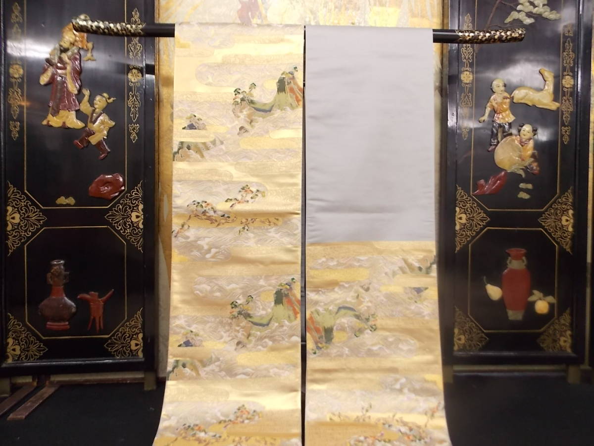 > きもの今昔2907 正絹西陣織袋帯 高級本金箔使用のエ霞(平安朝の絵図にある雲取りでカタカナのエの形しているから)