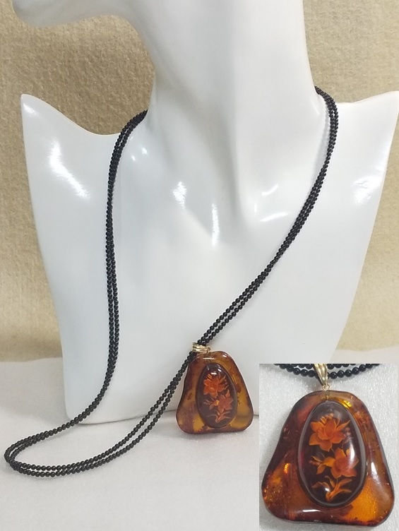 > ★最終80%OFF 琥珀 天然石 ロングネックレス コニャック インタリオ彫り 不定型 薔薇 58cm K18★AT1395-39