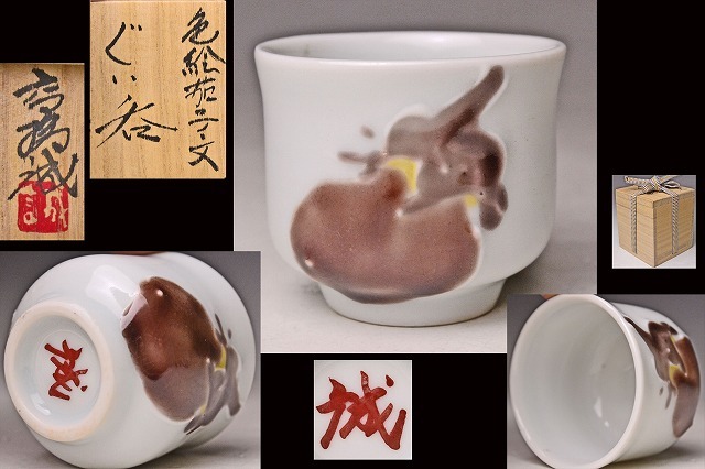 - 高橋誠 ★ 色絵 茄子文 ぐい呑 ★ 共箱 ★ 師:人間国宝 藤本能道 ★ 氏らしい立体感のある絵付で美しい逸品 ★ 酒器 ★ 京焼 ★