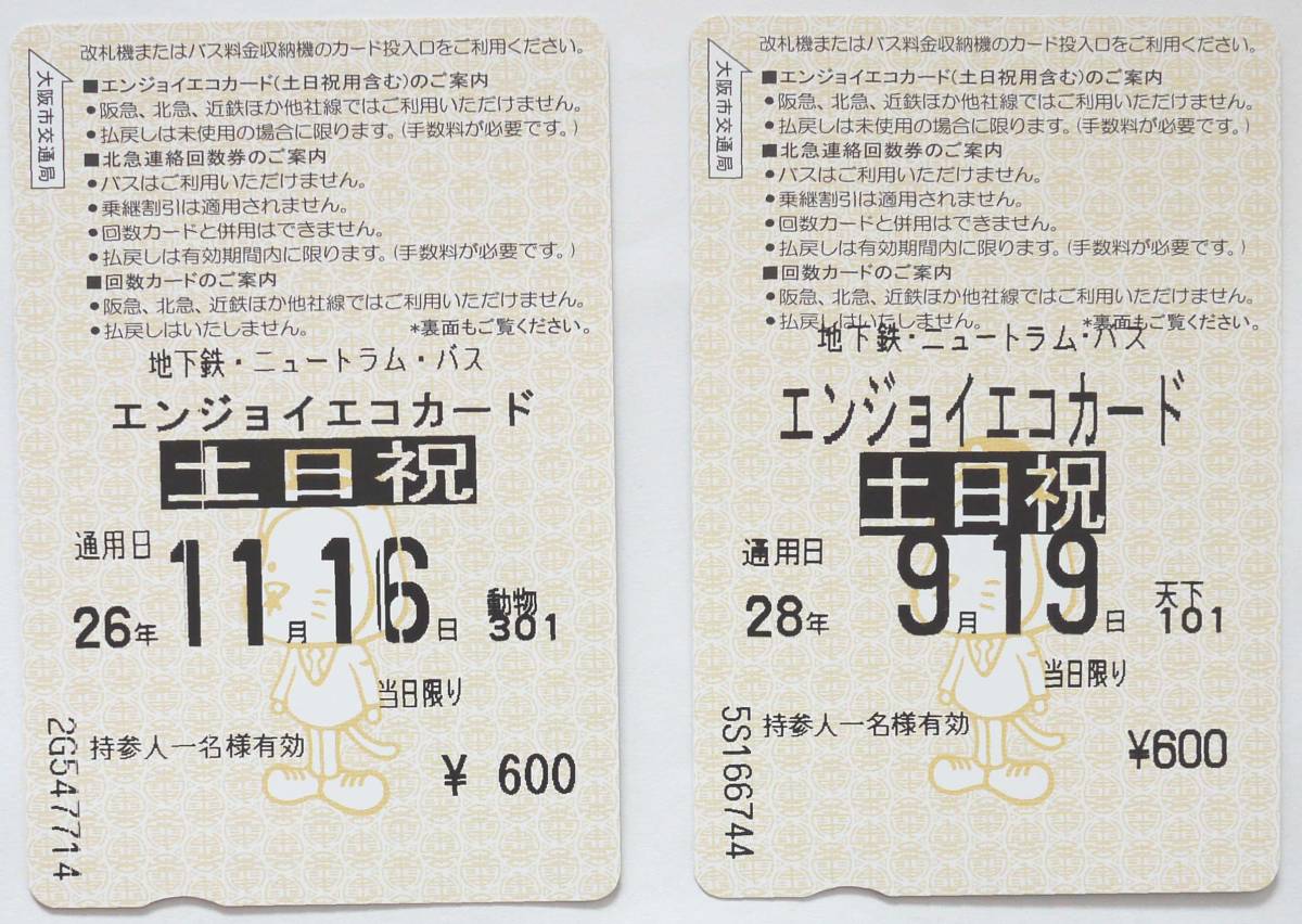 - 【送料85円/使用済】大阪地下鉄・大阪シティバス 1日乗車券 2枚 エンジョイエコカード土日祝用の新旧文字のデザイン2枚 1day pass