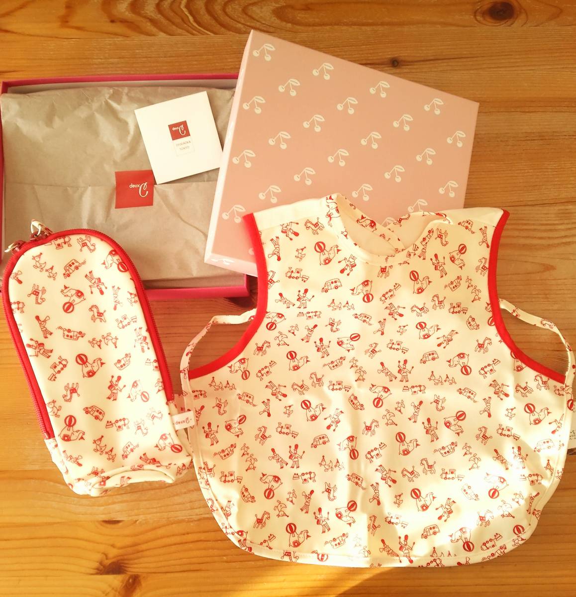 - ベビーランチスタイ90㎝ + 哺乳瓶ケース セット トイボックス柄アイボリー×赤 綿100%日本製 食事エプロン ドゥセー フィル・エ・クチーレ