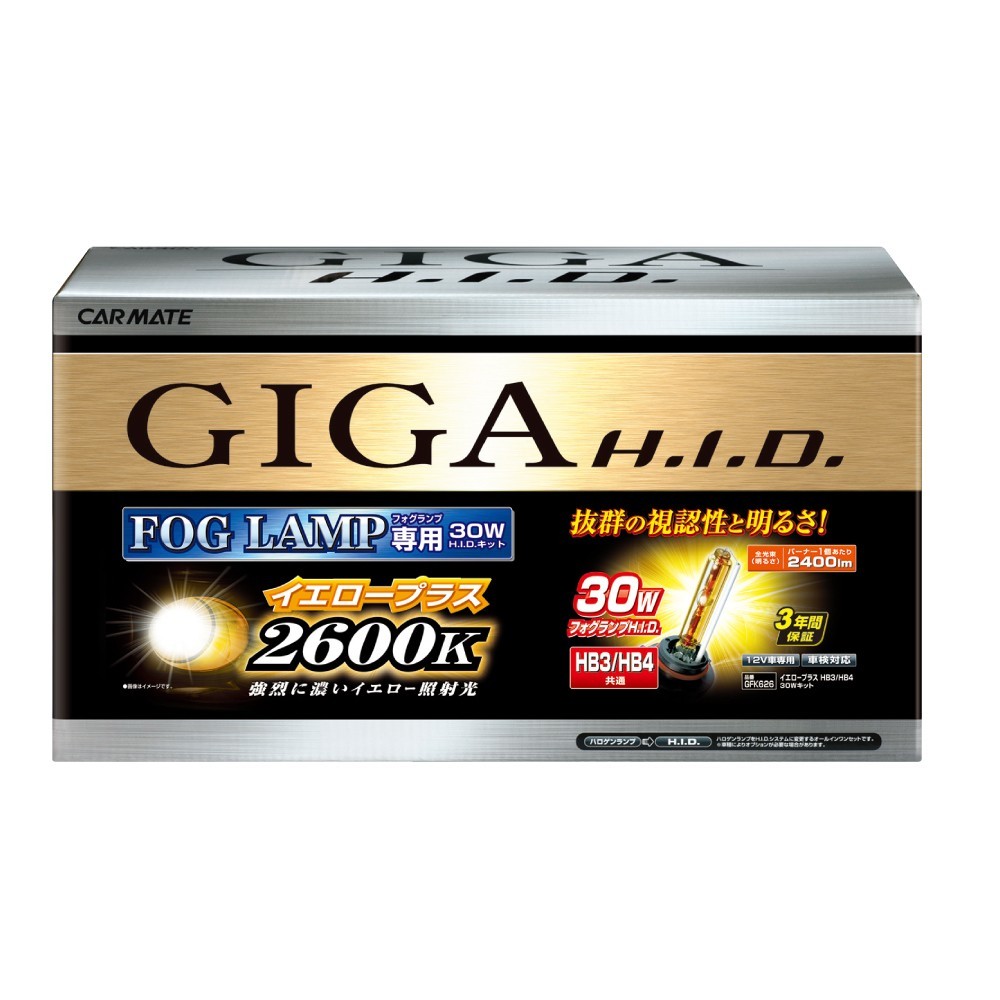 ●フォグランプ専用30Wコンバージョンキット(HB3/HB4共通タイプ) イエロープラス2600Kは、車検対応モデルで最も濃いイエローH.I.D.光を実現!(2014年10月現在当社実測値) 「強烈に濃いイエロー照射光」は、拡散せずに路面を照らし、雨・霧・雪などの悪天候時に抜群の視認性を確保します。色温度:2600K 明るさ:2400lm 安心の(3年間保証)