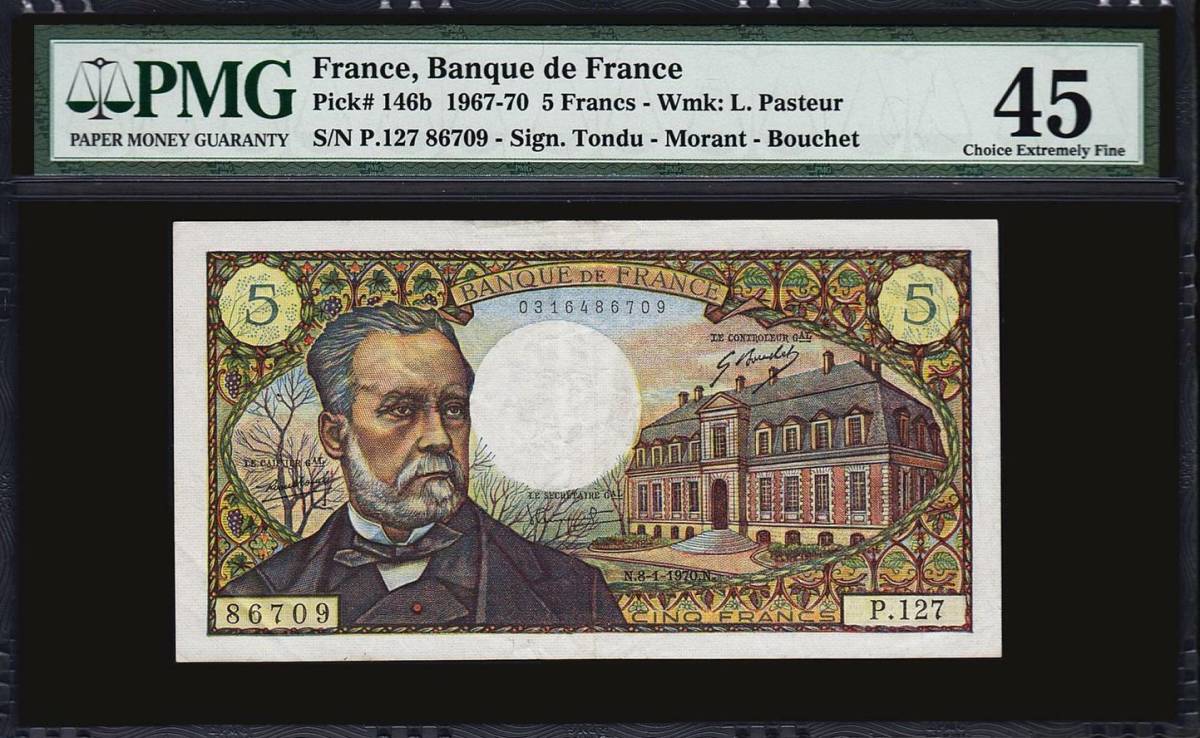 - (B-802) フランス5フラン紙幣 1967-70年 PMG EF45 ルイ・パスツール ②