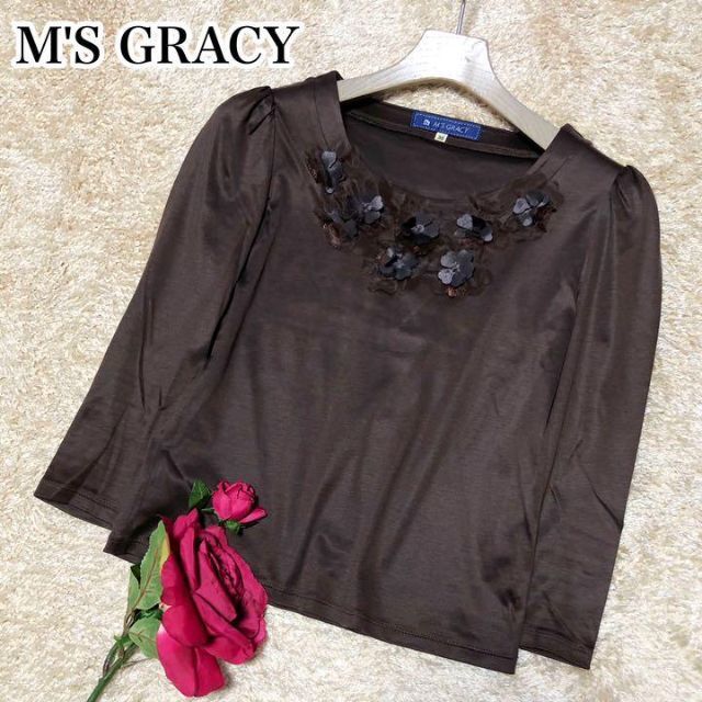 - M'S GRACY エムズグレイシー 七分袖 カットソー 立体フラワー ブラウン 38サイズ