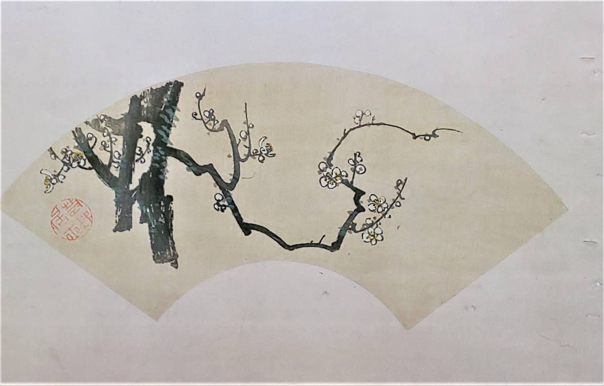 - 伊藤若冲の版画扇面画12「白梅の図」本物版画「名家百選画譜」明治29年青木嵩山堂彫刻者武藤稲蔵