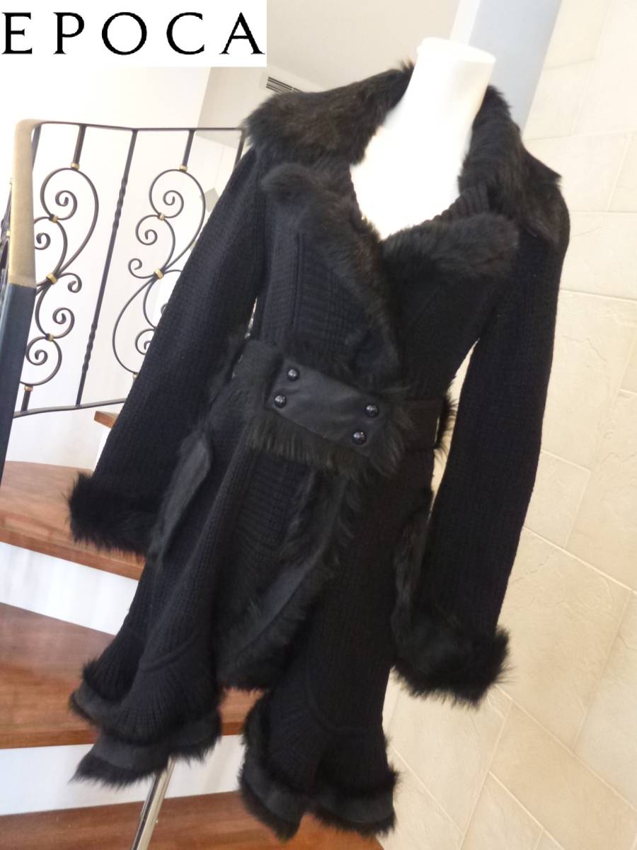 - 完売・美品 EPOCA エポカ★黒 羊革使い ニット ロング コート 40 M相当