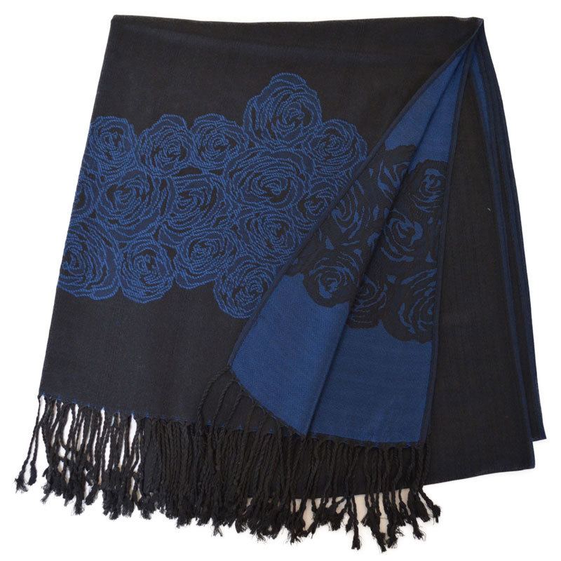 - ローズ花柄 刺繍入り リバーシブル 大判 ストール ブラック&ネイビー