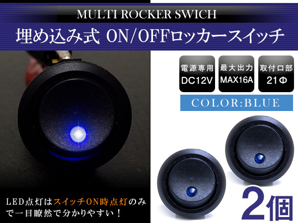 > 【2個】汎用 丸型 ON/OFFスイッチ 21mm 21φ ロッカースイッチ 12V ブルー 青 船 キャンピングカー 埋め込み 増設スイッチ