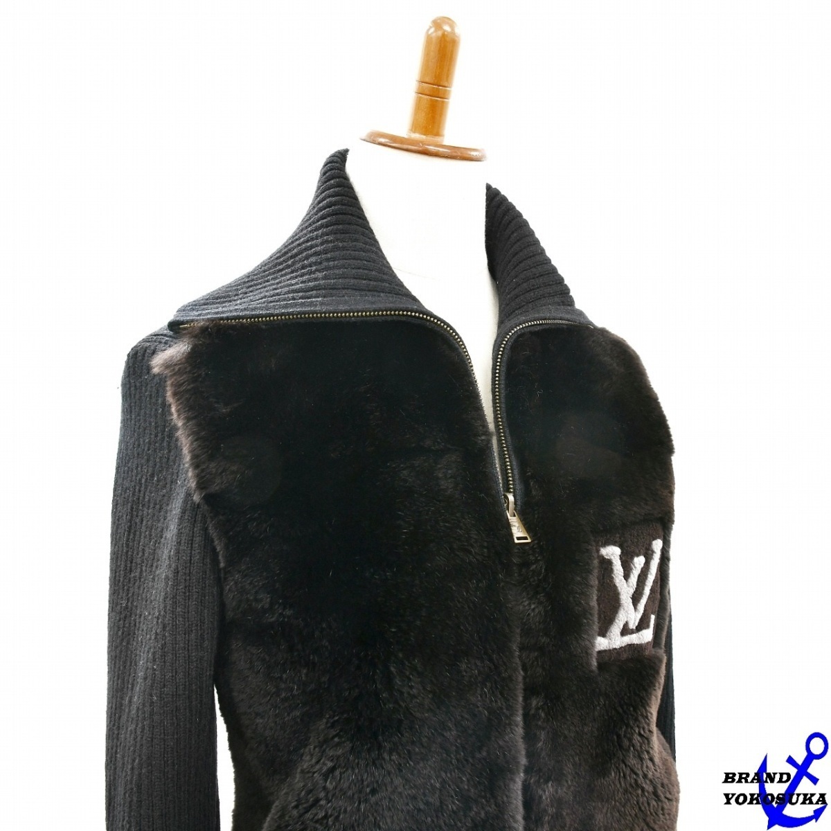 > 827 希少!! LOUIS VUITTON ルイヴィトン ラビットファー LVロゴ ドライバーズニット ブラック×ダークブラウン XS 女性 送料無料