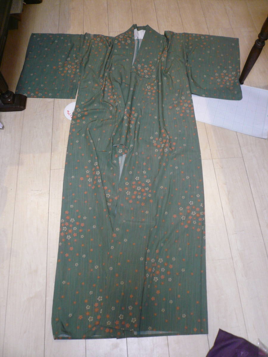 > AE即決 KIMONO 着物 小紋 ひとえ 桜柄緑Green 和柄古典 レトロ クラシック 着物 和装 送料600円