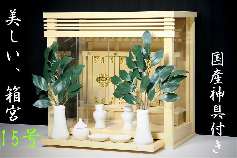 - 神棚セット 箱宮三社 壁掛け 中型 15号 三面ガラス宮 神具付