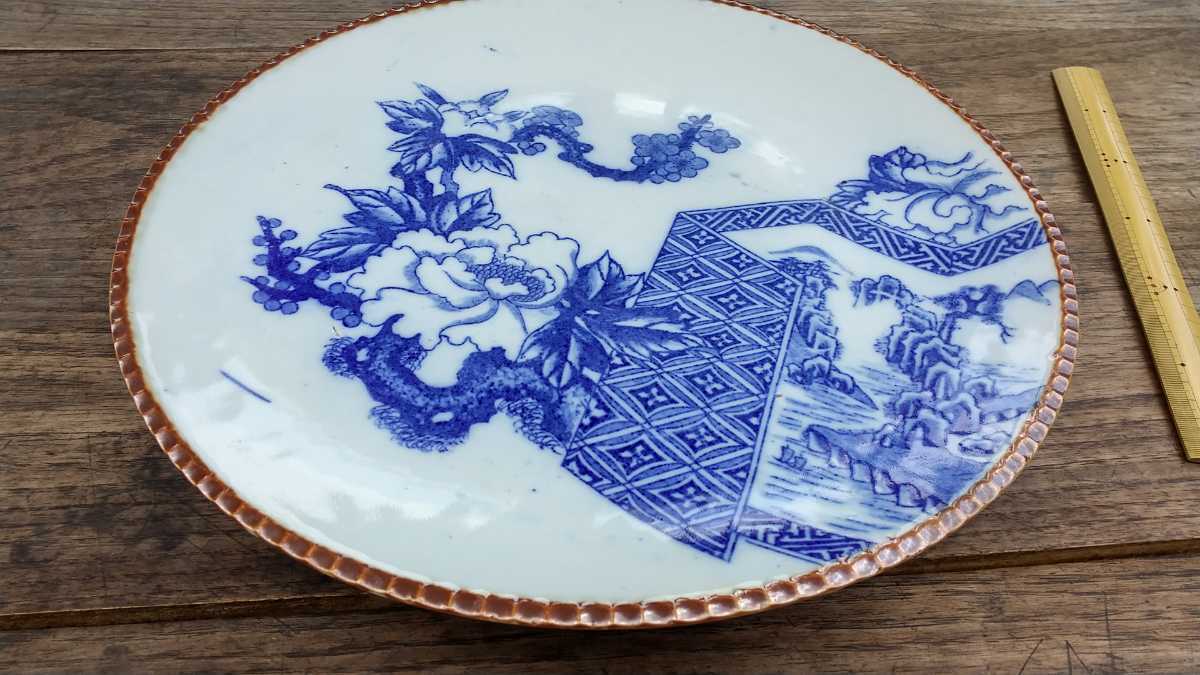- 明治~大正期 印判手いげ皿 牡丹に七宝文様屏風に山水の構図