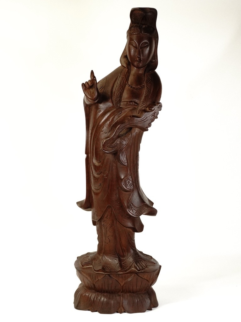 - 縁起物 一本の丸太から作られ 経年の艶がある見事な逸品! 中国古玩 中国古美術 唐物 一刀彫観音像 紫檀 木製 縁起物 高さ47.5㎝ TOT