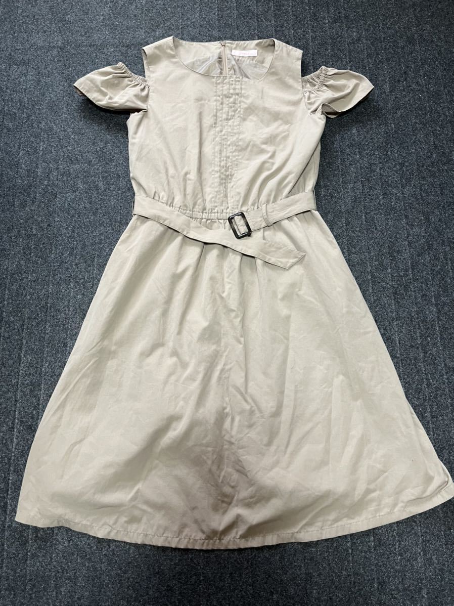 > オープンショルダー 膝下丈ジャンパースカート フリルノースリーブ ワンピース ベージュラテカラーブラウン オフショル ウエストベルト