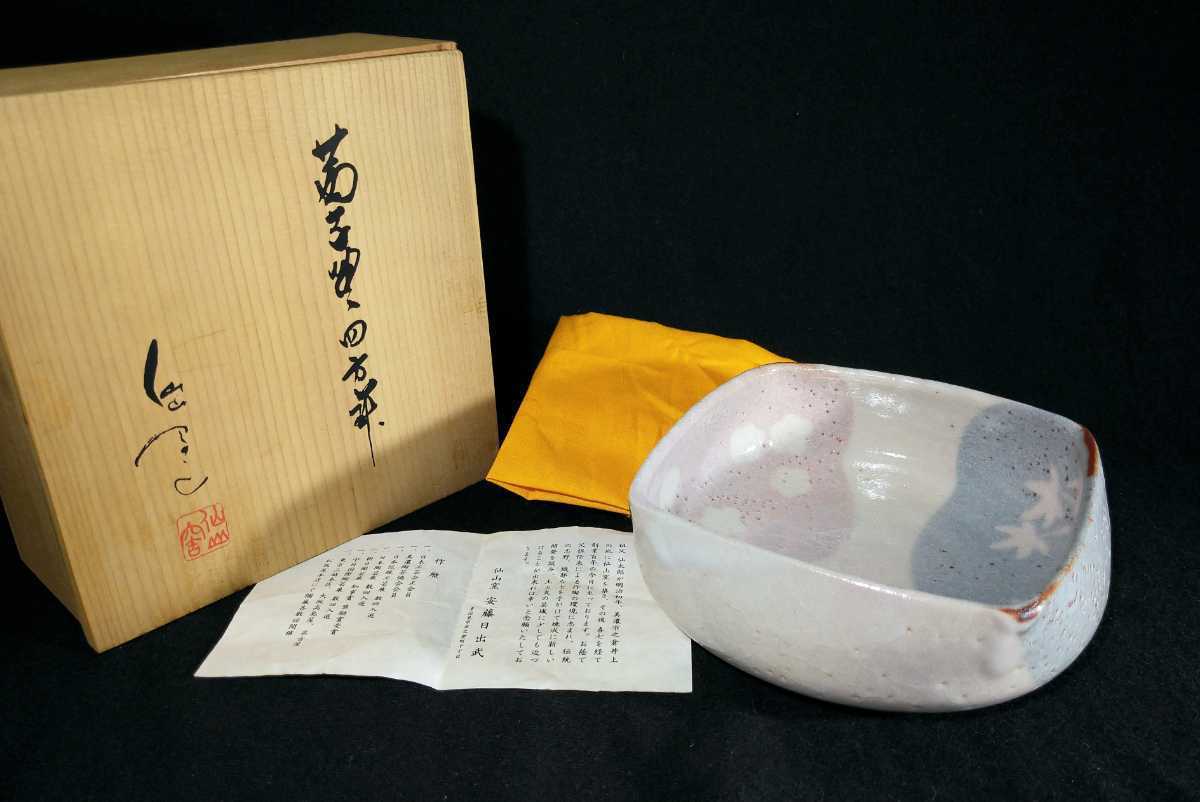 > 安藤日出武 色絵 紅葉文 菓子鉢 共箱 黄布 仙山窯 県無形文化財保持者 四方鉢 鼠志野 茶道具 bd-27b93