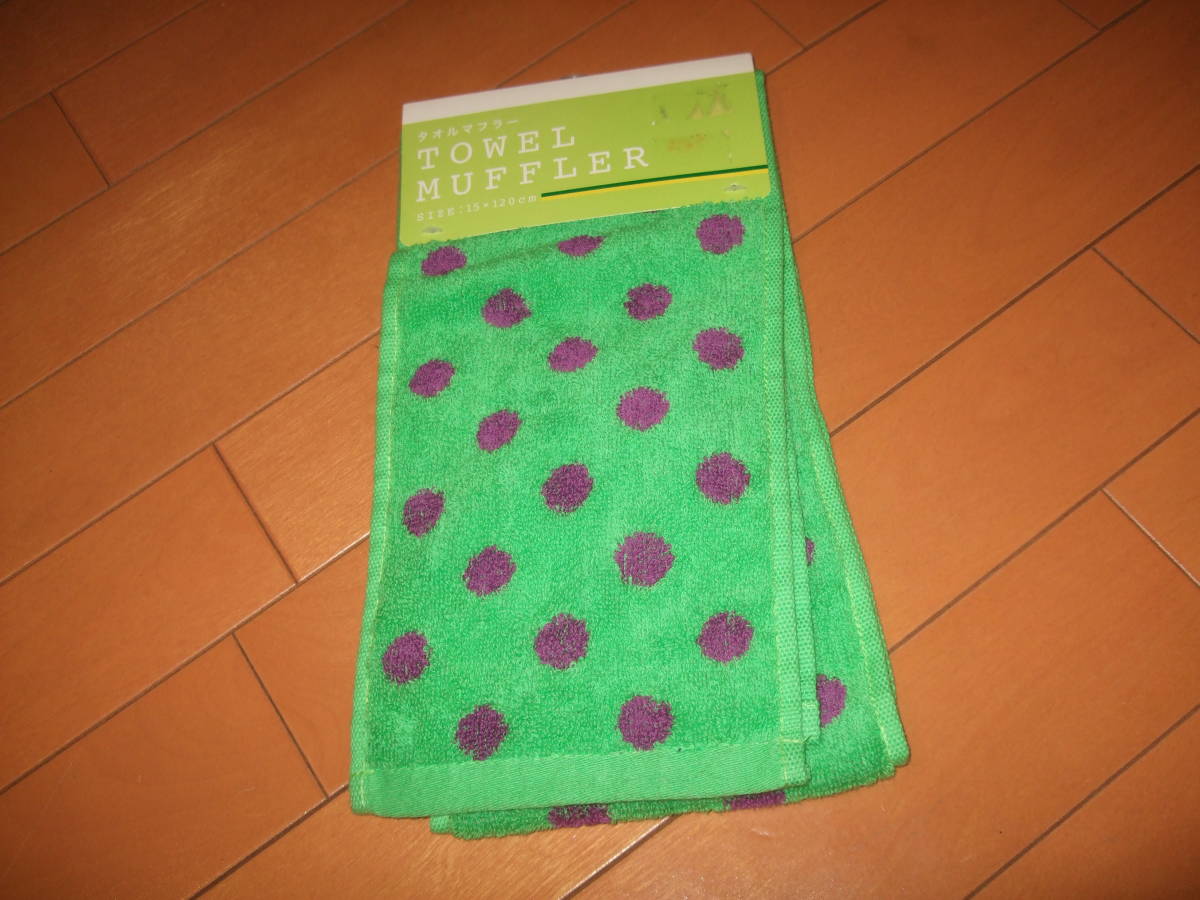 - 新品未使用即決送料込☆タオルマフラー 水玉 グリーン×パープル