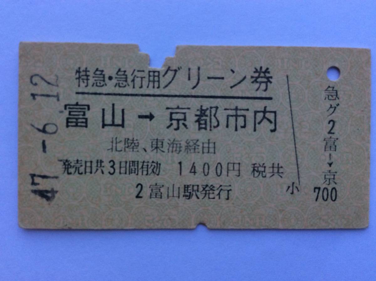 - 国鉄 特急 急行用グリーン券 富山→京都市内 昭和47年