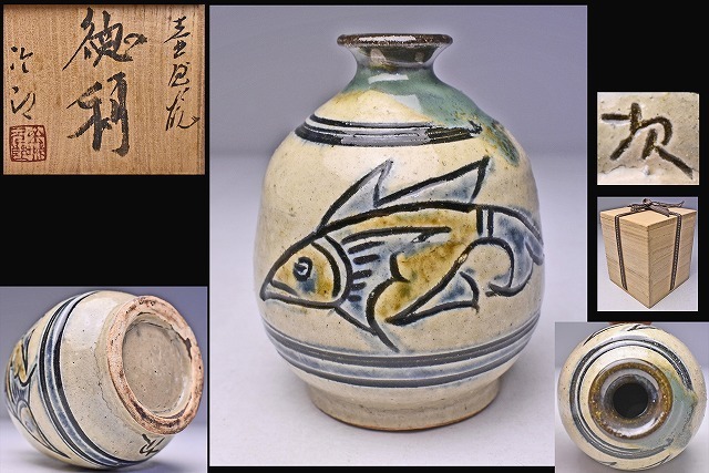 - 金城次郎 ★ 壺屋焼 徳利 ★ 共箱 ★ 人間国宝 ★ ゴロンと丸みを帯びた造形に青が美しい逸品 ★ 沖縄 酒器 ★検 小橋川仁王 新垣栄三郎