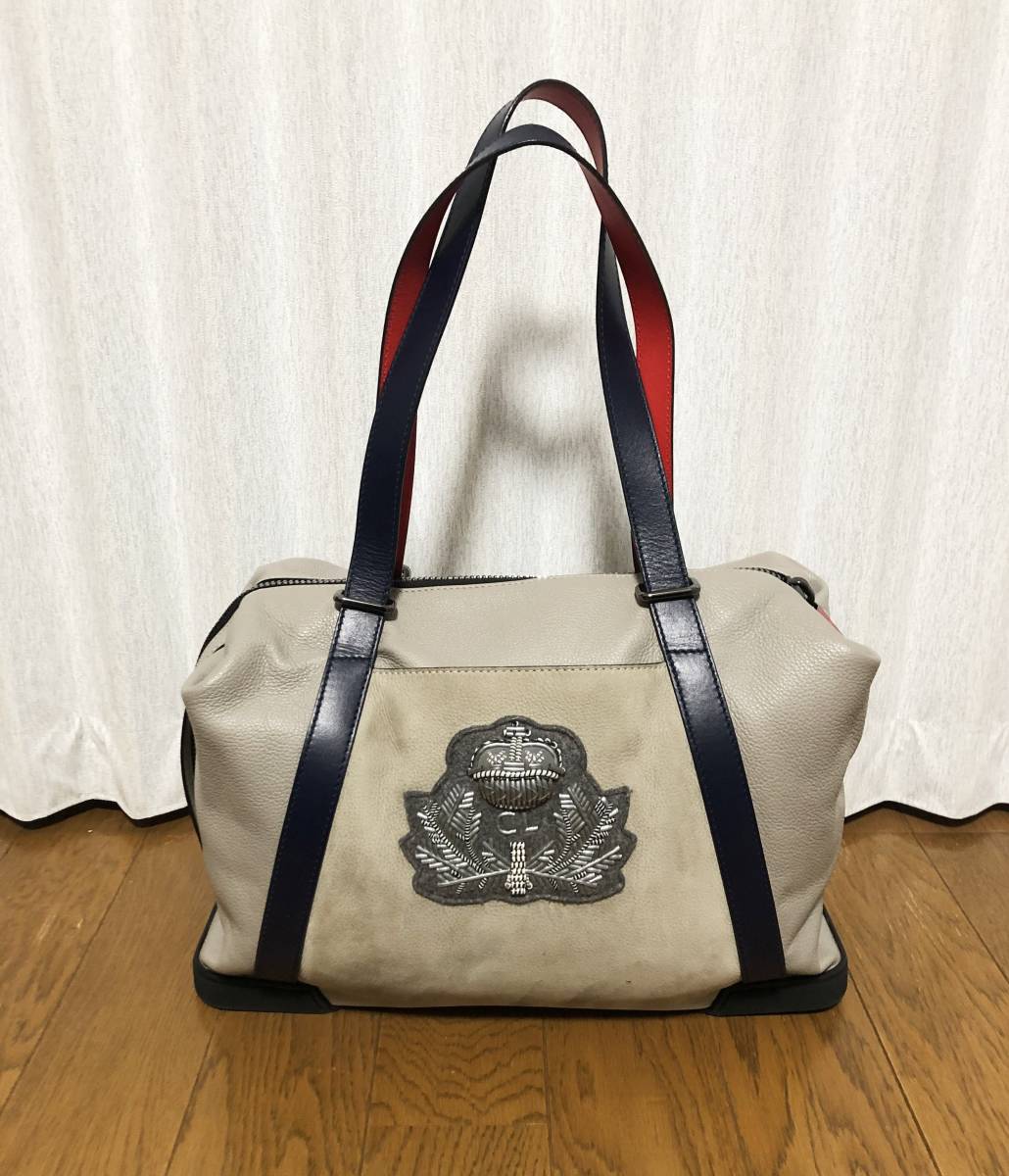 > 美品☆[Christian Louboutin] 16AW BAGDAMON エンブレム レザーボストンバッグ レッドソール グレー ネイビー クリスチャンルブタン