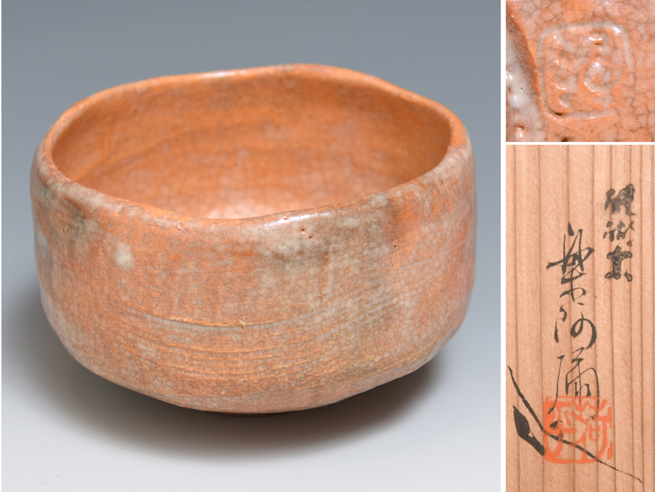 - 醍醐窯 楽阿弥 島荷平(造)赤楽茶碗 共箱 茶道具 現代工芸 陶磁器 古陶磁器 美品 z3406o
