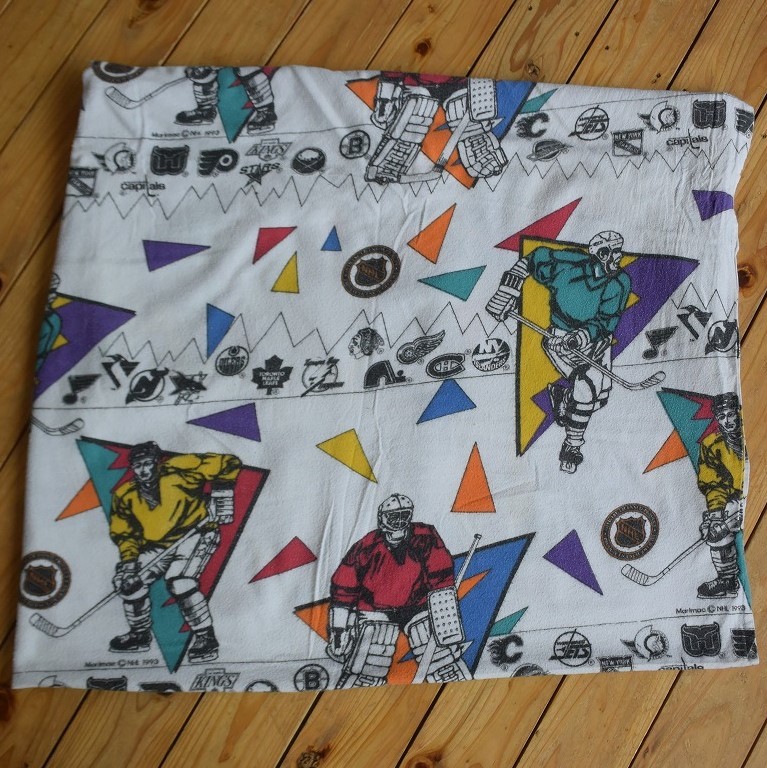 - USAヴィンテージ NHL アイスホッケー ベッドシーツ リメイク生地 素材 フラットシーツ スポーツチーム ゲーム アメリカ仕入 総柄 B1276