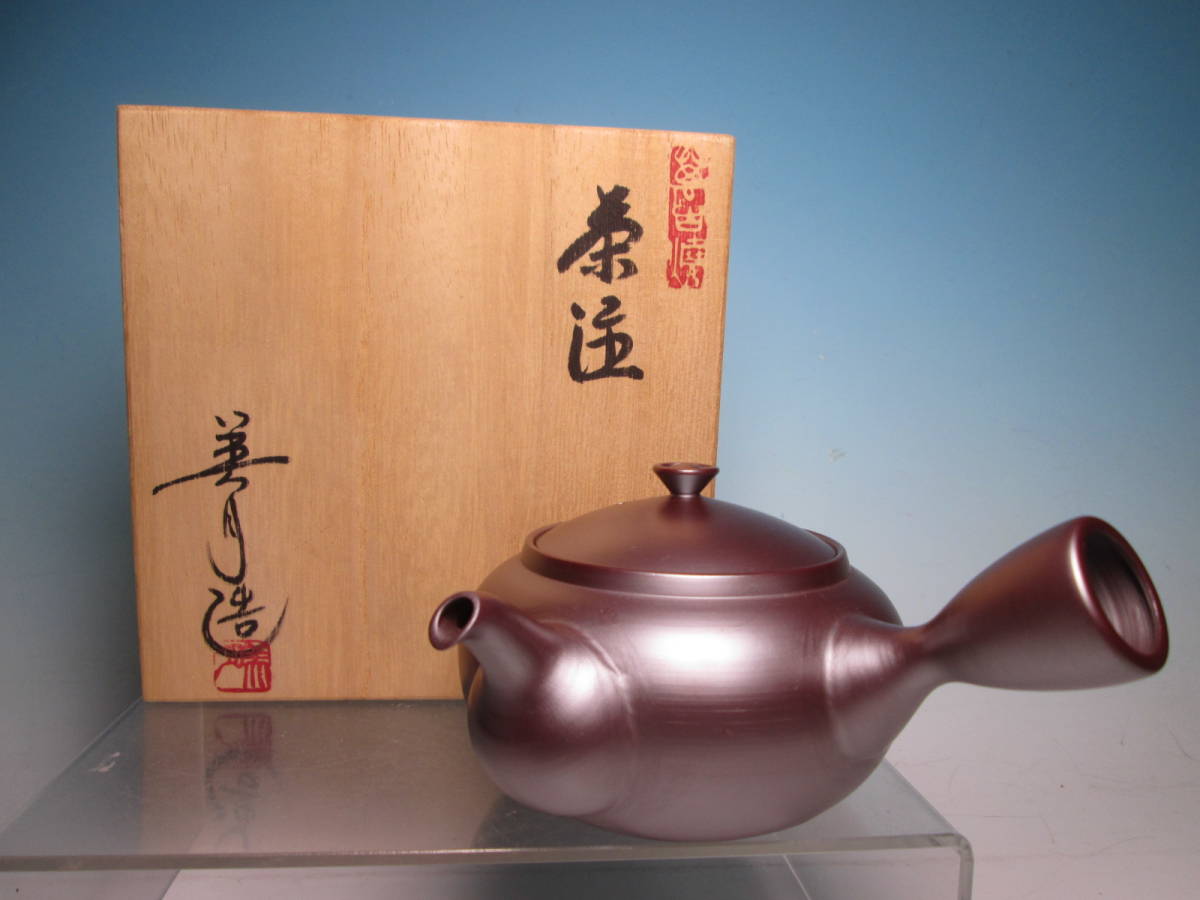 - ☆煎茶道具 萬古焼 美月 造 紫泥 横手煎茶急須 共箱 未使用品 B1