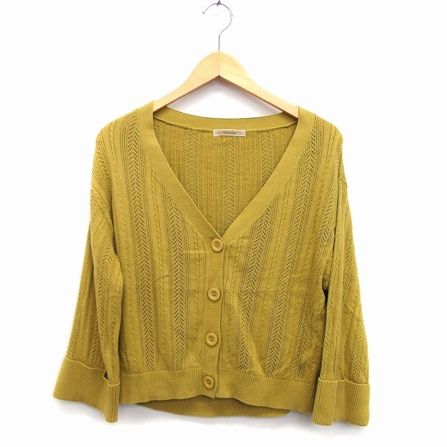 - ナイスクラップ NICE CLAUP ニット カーディガン Vネック 長袖 綿混 かぎ針編み ロープ編み リブ F カーキ /HT2 レディース