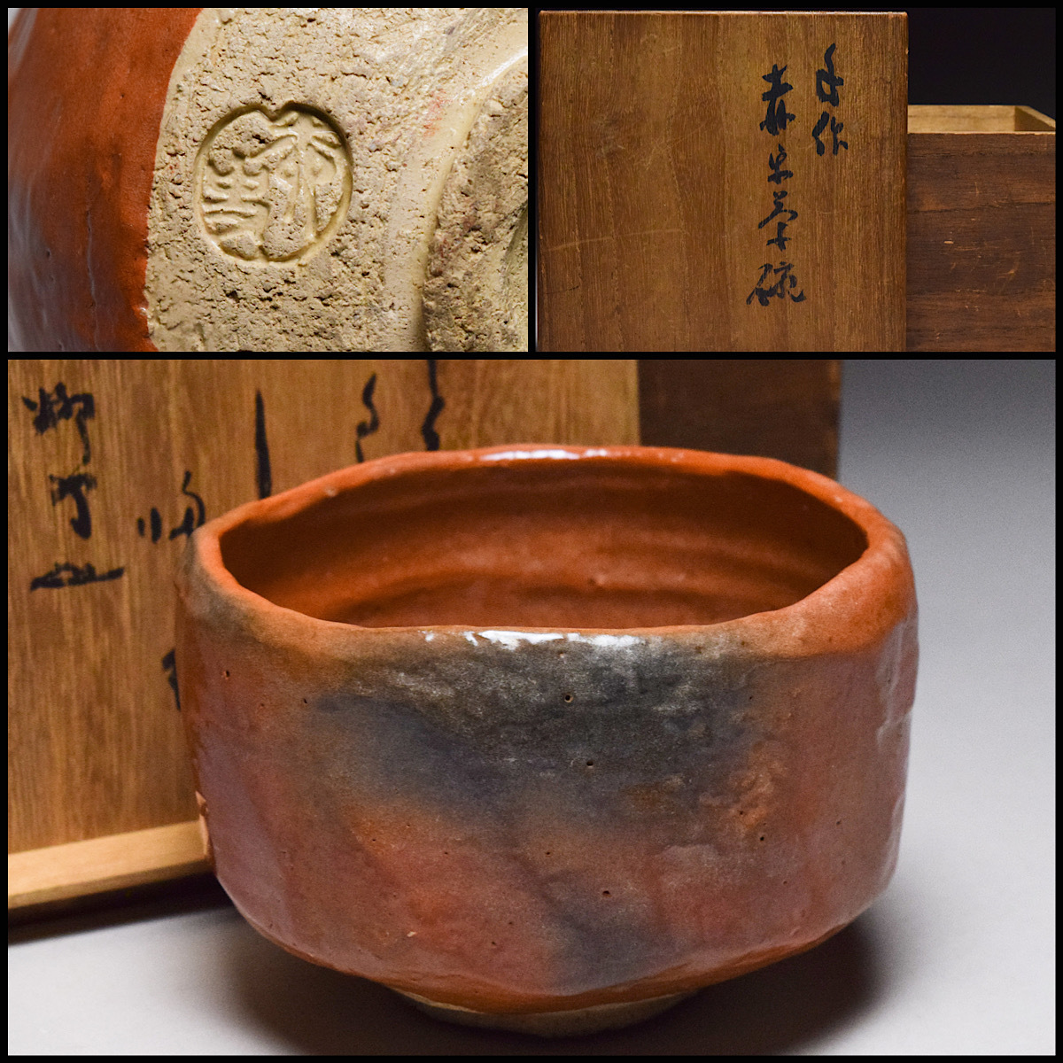 - 【八八八】赤松柳史 赤楽 茶碗 ◆歌詠み書付箱付 縁剥がれ有 【z-121】