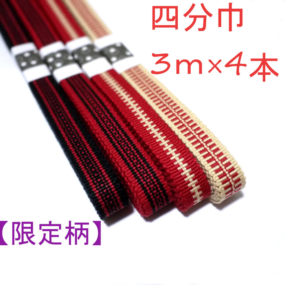 > 【限定柄】四分巾 四分紐 3m×4本セット 国内産 木綿真田紐 綿100% 赤・黒Samurai ribbon(Sanadahimo)