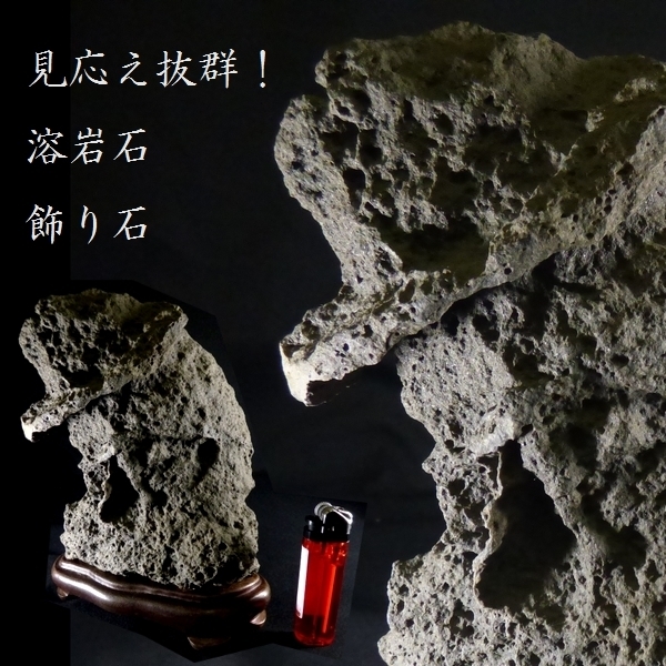 【 恵 #0155 】 溶岩石 鑑賞石 盆石 庭石 飾り石 木製台座付 検:天然石/水石/名石/自然石/流石