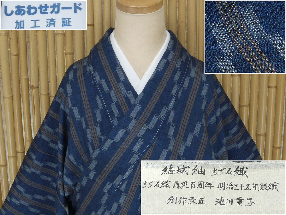 - 【京かんざし】t-735「創作意匠 池田重子」結城紬ちぢみ織 奥順謹製 はたおり娘 躾糸付未着用身丈163 cm裄丈68.5 cm★即決送料無料!