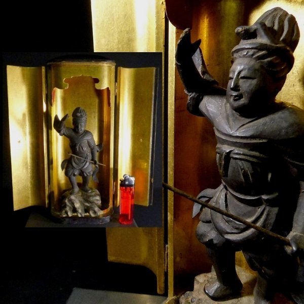 - 【 恵 #0293 】 時代物 木彫 厨子入り 毘沙門天立像 仏教美術 幕末 検:仏教美術/仏像/毘沙門/厨子/十二神将
